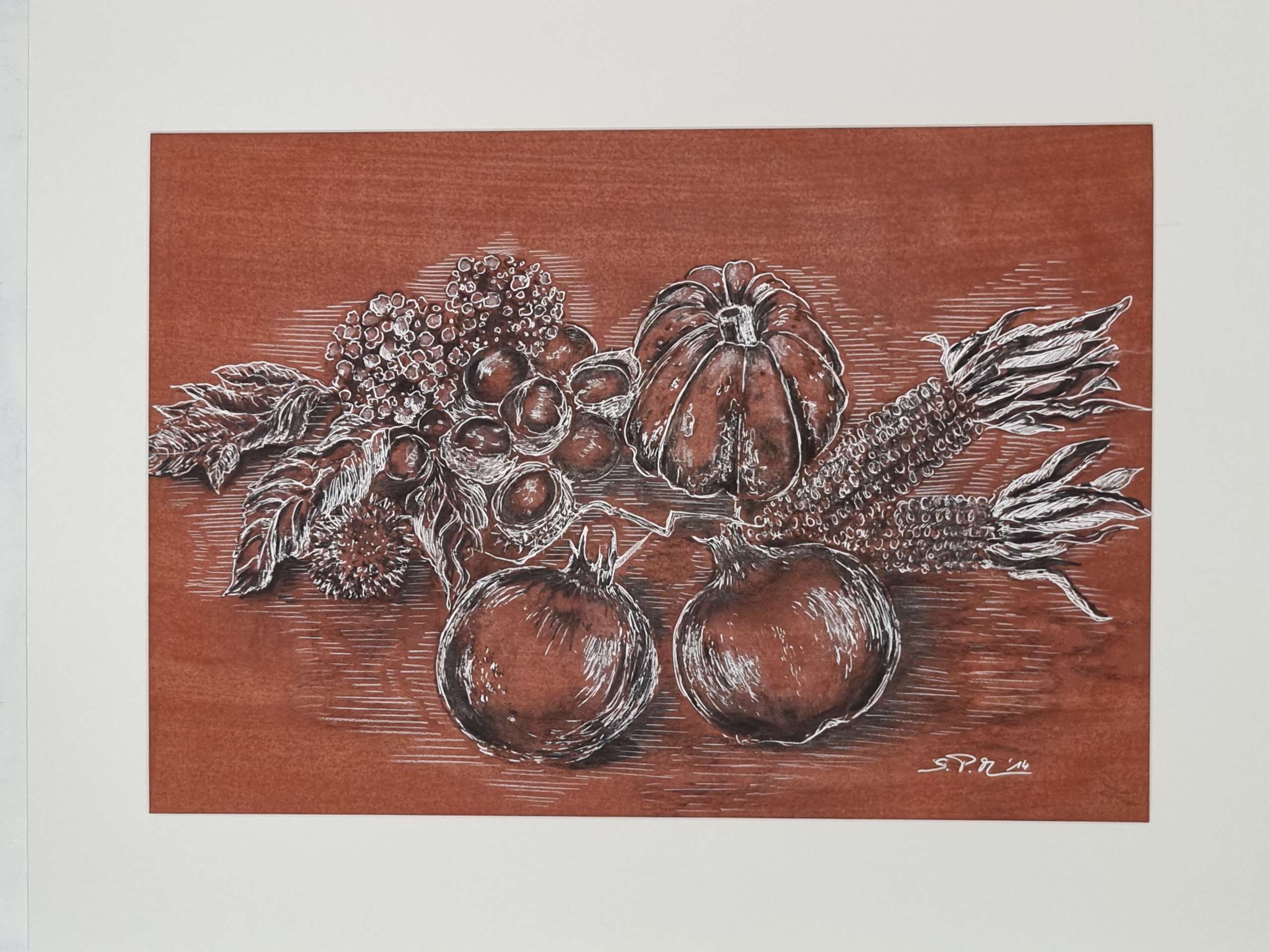 Kohle u. weiße Tusche auf rotgrundiertem Papier